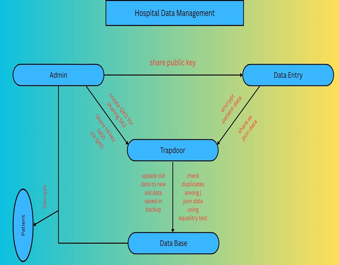 This project presents a secure and efficient hospital data management framework inspired by the paper “An Efficient and Generic Construction of Public Key Encryption with Equality Test under the Random Oracle Model” (Choi et al., 2025). The proposed system integrates PKE-ET with Quantum Key Distribution (QKD) to ensure confidentiality, duplication control, and reliable retrieval of patient data stored in the cloud. The architecture is composed of three portals: (1) Admin Portal for key generation, equality testing, and decryption; (2) Data Entry Server for encrypting and uploading patient records as JSON; and (3) Trapdoor Server, which securely receives session keys via Quantum E91 and validates duplicates before storage. The system ensures that duplicate or outdated data are replaced while maintaining backups of older records. By applying cryptographic equality tests, doctors can securely retrieve patient information using encrypted patient IDs. Compared to existing PKE-ET frameworks, our system adapts the concept for real-world hospital environments, improving data confidentiality, integrity, and efficiency in patient record management.