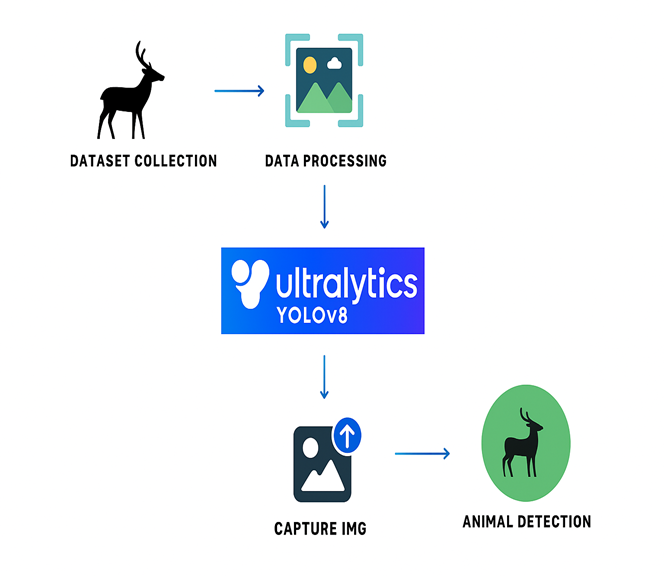 The proposed system leverages the advanced capabilities of YOLOv8 for detecting animals on highways at night. Unlike older anchor-based models, YOLOv8 employs an anchor-free detection head that improves localization of small and distant animals, a common challenge in low-light highway environments. Its transformer-enhanced backbone extracts richer features, making it more resilient to noise and glare from vehicle headlights. The built-in augmentation strategies of YOLOv8, such as mosaic and mixup, enhance model robustness during training on limited datasets. The system also benefits from YOLOv8’s optimized loss functions, including CIoU and dynamic label assignment, which improve convergence and detection accuracy. This ensures the model can run efficiently in cars or roadside units, providing reliable alerts to prevent animal-vehicle collisions. Overall, the integration of YOLOv8’s modern architecture with optimized deployment makes it a practical and effective solution for enhancing road safety.
