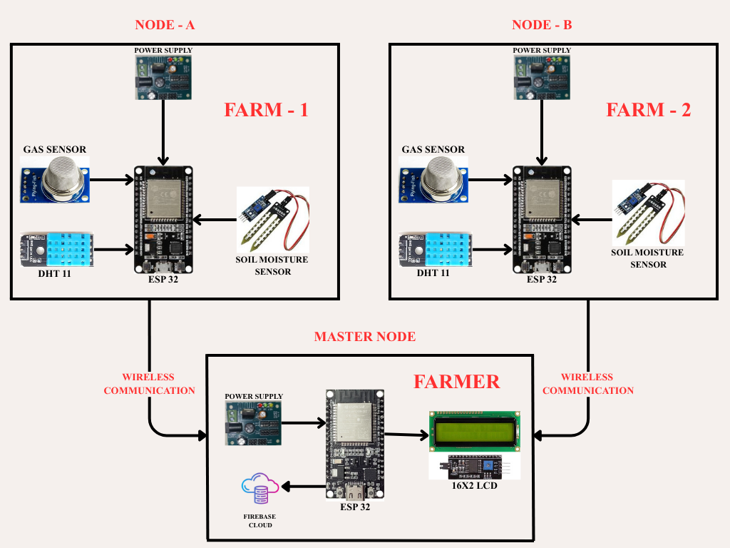 The proposed system introduces an intelligent smart farming architecture using IoT-enabled wireless sensor nodes built around the ESP32 microcontroller. The system consists of three nodes: two slave nodes deployed at different locations in the farm and one master node acting as the central gateway. Each slave node is equipped with a DHT11 sensor for temperature and humidity monitoring, a gas sensor for detecting harmful environmental gases, and a soil moisture sensor to measure the moisture level in the soil. These nodes continuously sense the environmental parameters and transmit the collected data to the master node through ESP-NOW, a fast, secure, and low-power peer-to-peer wireless communication protocol. The master node receives data from both slaves, processes it, and uploads the values to Firebase Cloud for remote real-time monitoring via mobile or web applications. It also displays the latest readings on a 16×2 I2C LCD, enabling quick on-site viewing for farmers. This distributed architecture improves coverage, reduces wiring complexity, and ensures reliable monitoring across large farmlands. The system empowers farmers to make timely decisions related to irrigation, fertilization, and environmental control, ultimately improving crop health, reducing manual labor, and increasing agricultural efficiency.